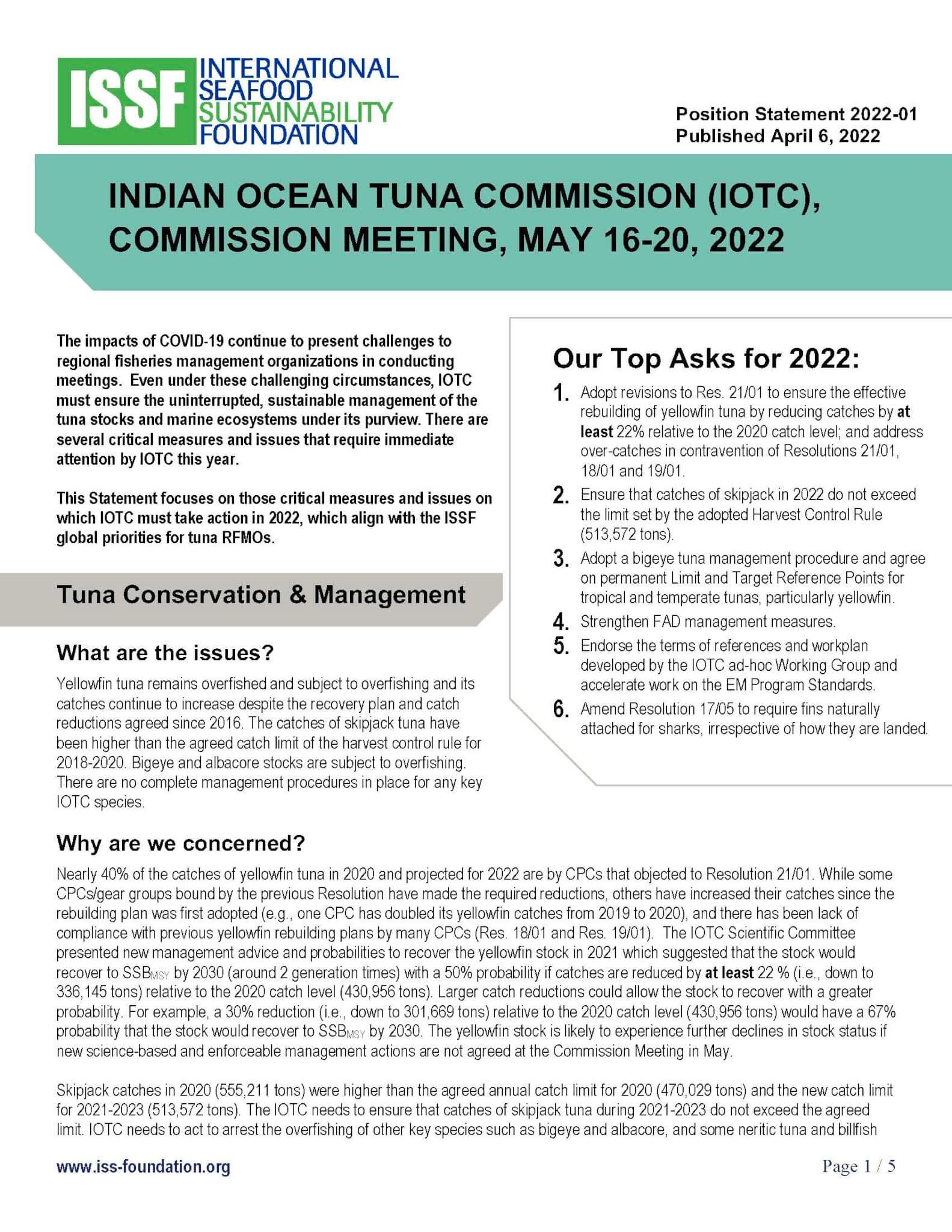 This ISSF position statement focuses on critical measures and issues on which the Indian Ocean Tuna Commission (IOTC) must take action at its meeting on May 16-20, 2022, which align with the ISSF global priorities for tuna RFMOs.