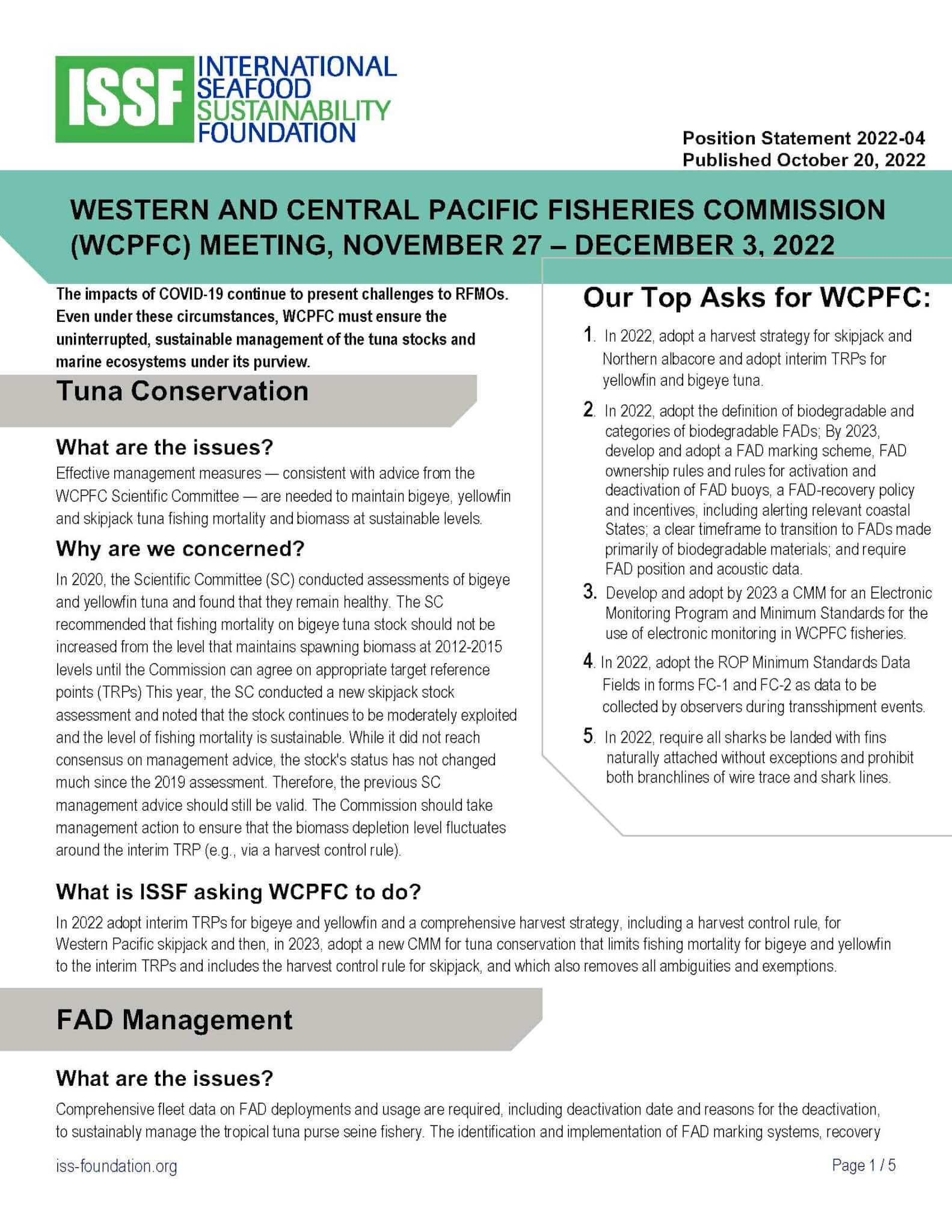 ISSF prepared this position statement for consideration at the 19th regular session of the Western and Central Pacific Fisheries Commission (WCPFC), which will take place November 27-December 3, 2022. The statement covers topics in these categories: tuna conservation; fish aggregating device (FAD) management; harvest strategies; monitoring, control, and surveillance; bycatch and sharks; compliance; and capacity management.
