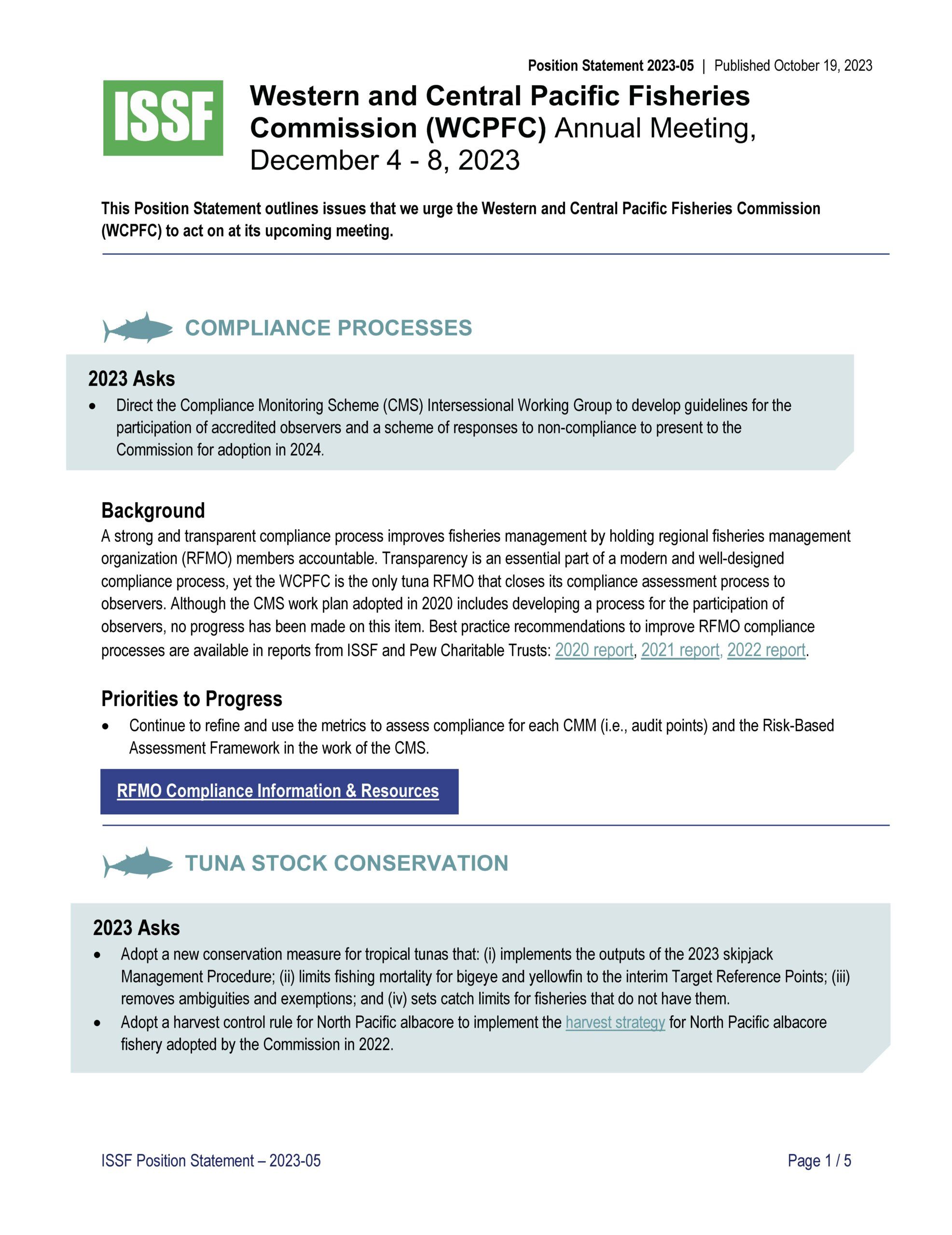 ISSF prepared this position statement for consideration at the 20th regular session of the Western and Central Pacific Fisheries Commission (WCPFC), which will take place December 4-8, 2023. The statement covers topics in these categories: compliance processes; tuna stock conservation; fish aggregating device (FAD) management; electronic monitoring and reporting and observer coverage; transshipment regulation; effective management procedures (harvest strategies); bycatch mitigation and shark protections; and capacity. The statement also includes ISSF’s top “asks” or requests of WCPFC.