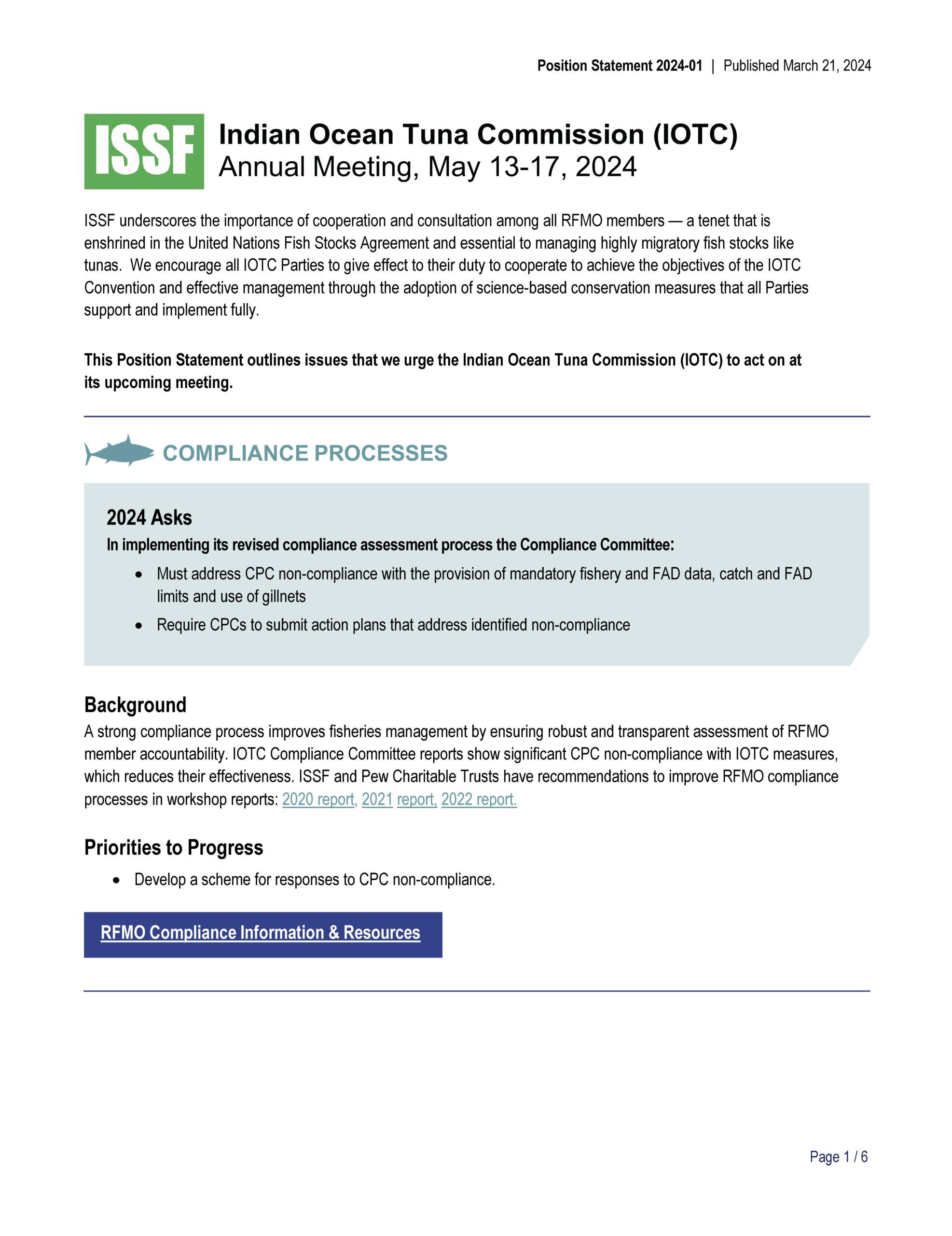 This ISSF position statement focuses on critical measures and issues on which the Indian Ocean Tuna Commission (IOTC) must take action at its 28th Annual Meeting on May 13-17, 2024, which align with ISSF’s priorities for tuna RFMOs.