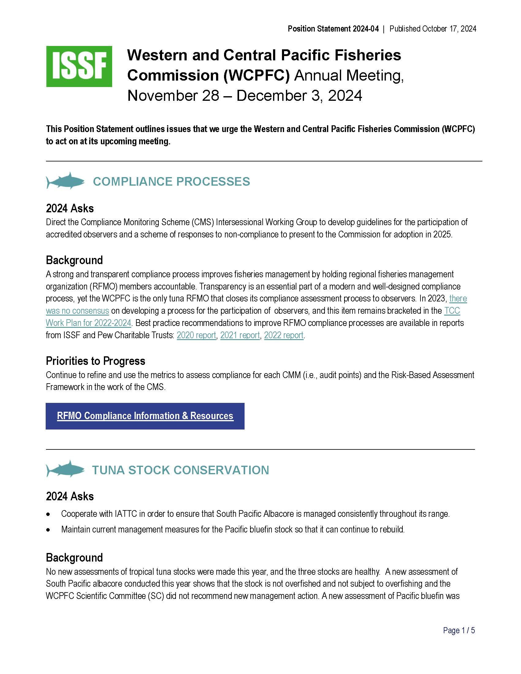 ISSF prepared this position statement for consideration at the 21st regular session of the Western and Central Pacific Fisheries Commission (WCPFC), which will take place November 28–December 3, 2024. The statement covers topics in these categories: compliance processes; tuna stock conservation; fish aggregating device (FAD) management; electronic monitoring and reporting and observer coverage; transshipment regulation; effective management procedures (harvest strategies); bycatch mitigation and shark protections; and capacity. The statement also includes ISSF’s top “asks” or requests of WCPFC.