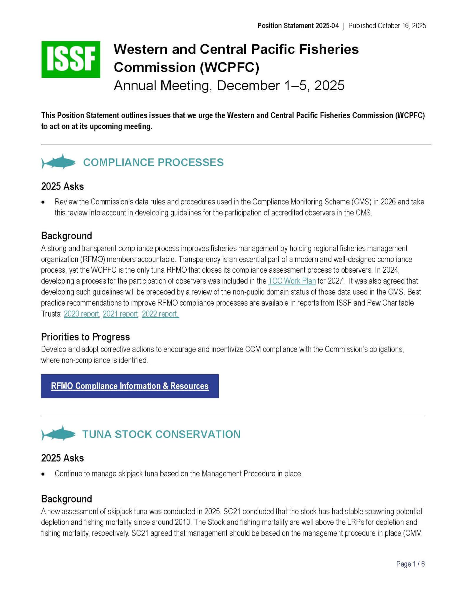 ISSF prepared this position statement for consideration at the 22nd regular session of the Western and Central Pacific Fisheries Commission (WCPFC), which will take place December 1–5, 2025.