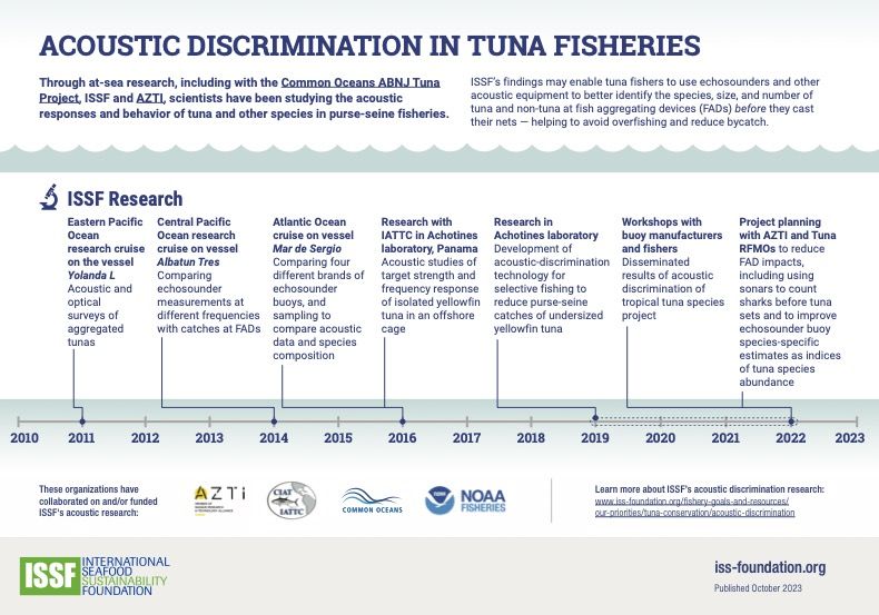 ISSF’s at-sea scientific research on acoustic technology to help discriminate tuna species — and allow for more selective fishing — is summarized on this infographic, created in October 2023. The timeline includes links and also shows the organizations partnering with ISSF on this research.