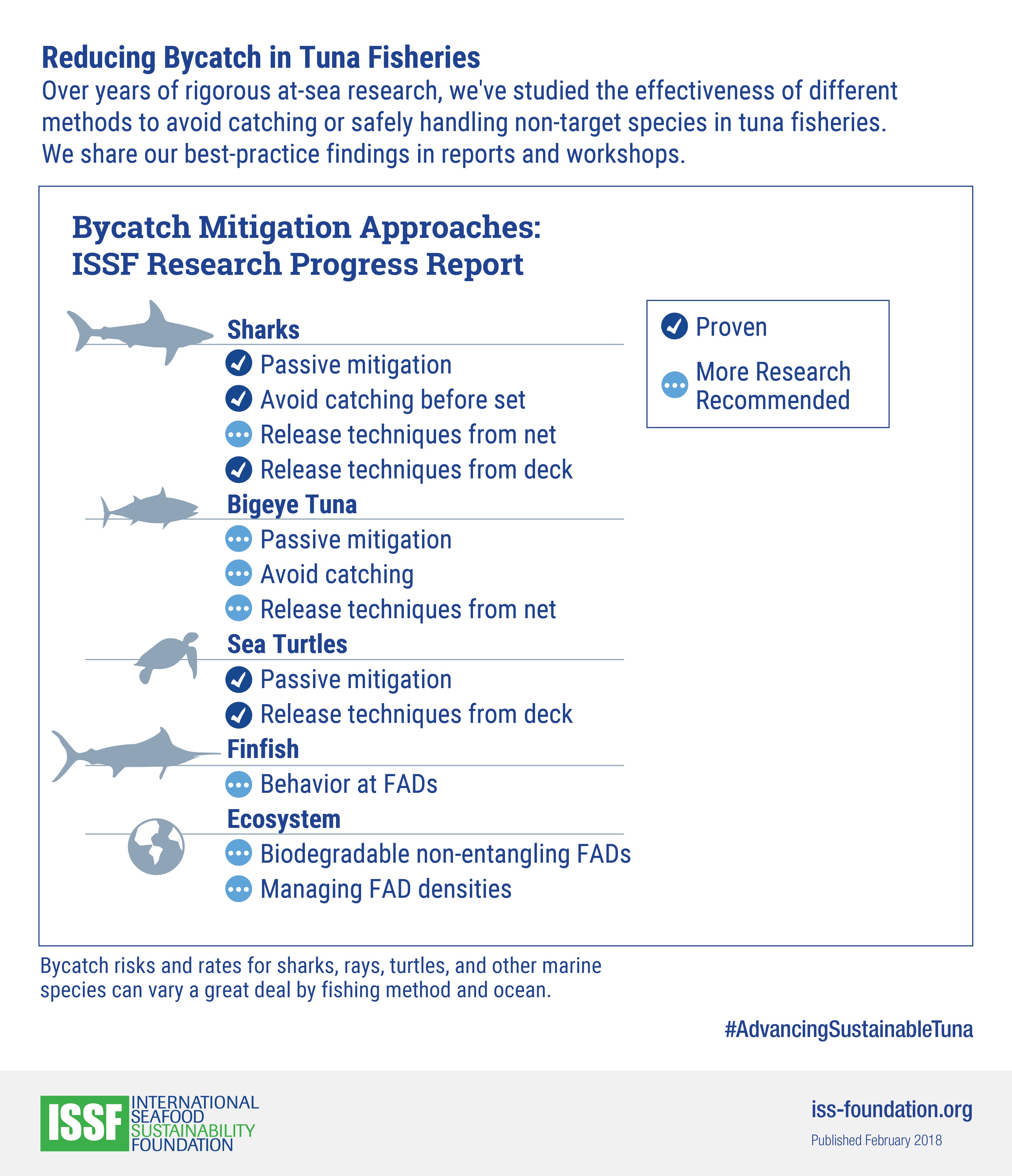This infographic is based on years of ISSF research into best practices for (1) avoiding catching non-target species during tuna fishing operations and/or (2) handling and releasing those species, when they are incidentally caught, with the best chance of survival. It shows the areas where best practices have been identified for sharks, bigeye tuna, sea turtles, and finfish, and also which methods warrant additional research.