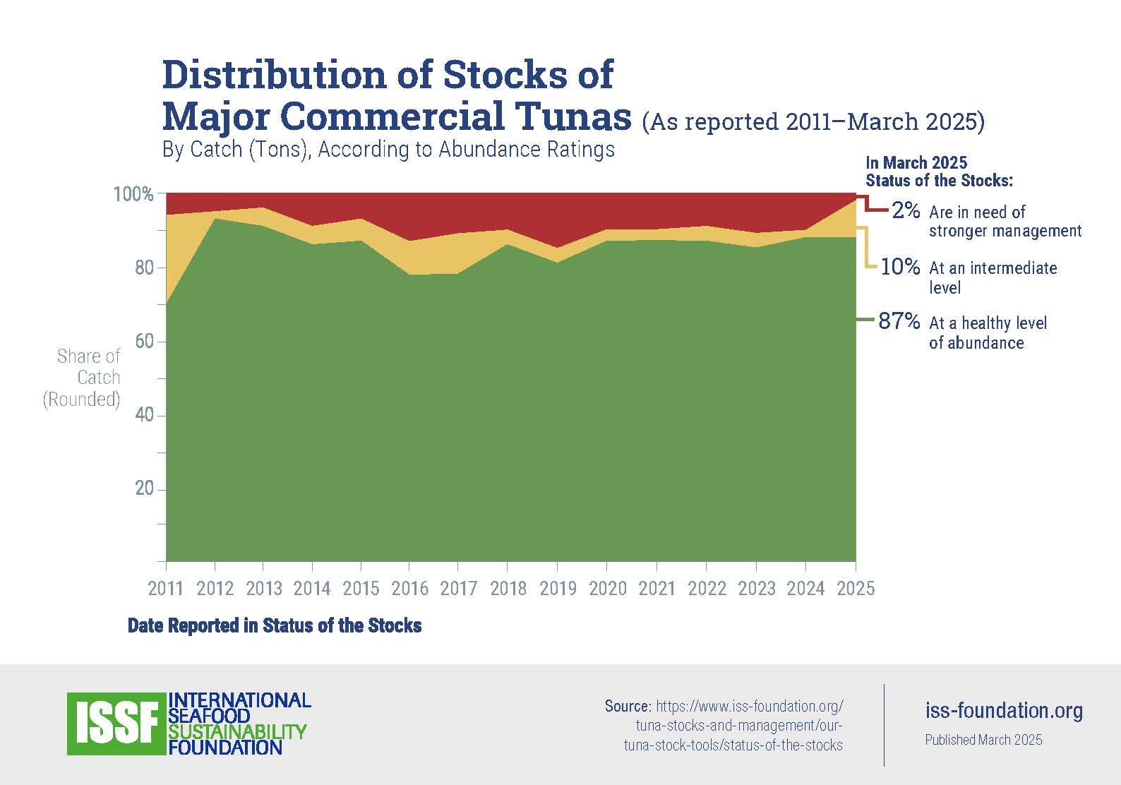 By catch, according to abundance ratings, this line graph tracks the distribution of major commercial tuna stocks using ISSF Status of the Stocks report data since 2011, including ISSF 2025-01: Status of the World Fisheries for Tuna. March 2025.