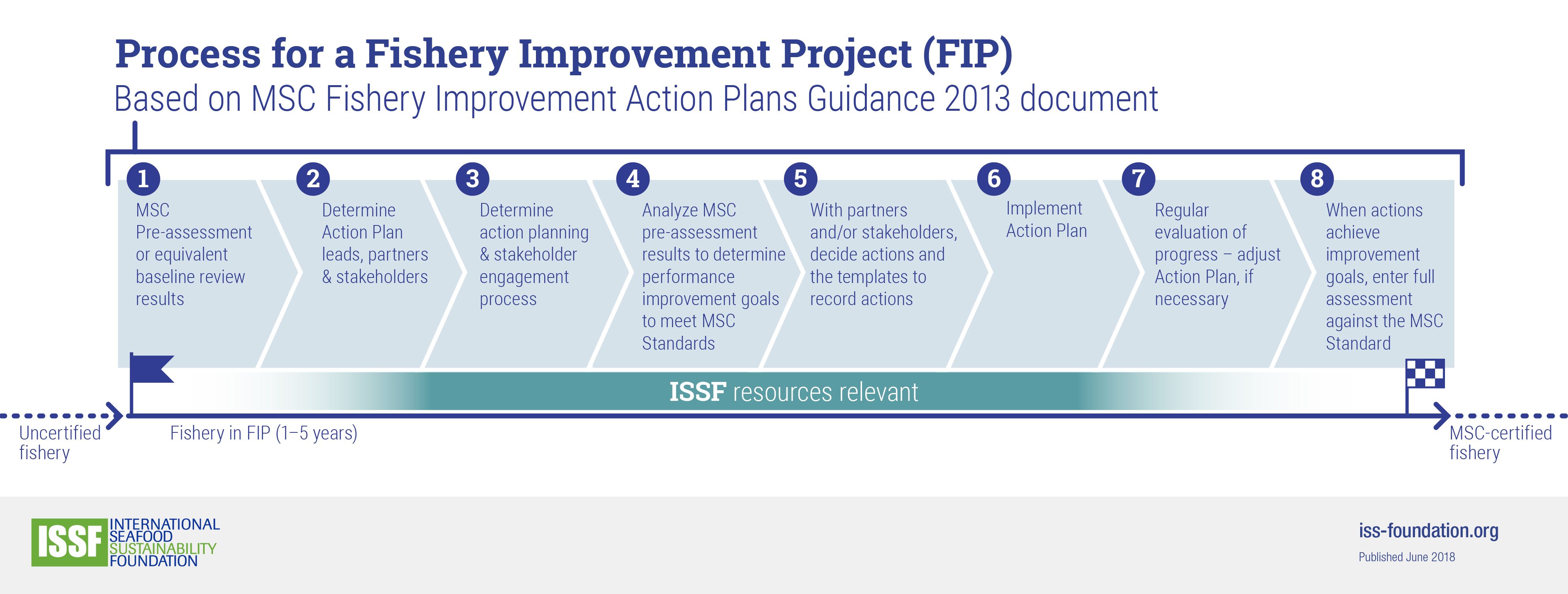 For fisheries in a fishery improvement project (FIP) with Marine Stewardship Council (MSC) certification as an objective, this infographic illustrates the stages of the process.