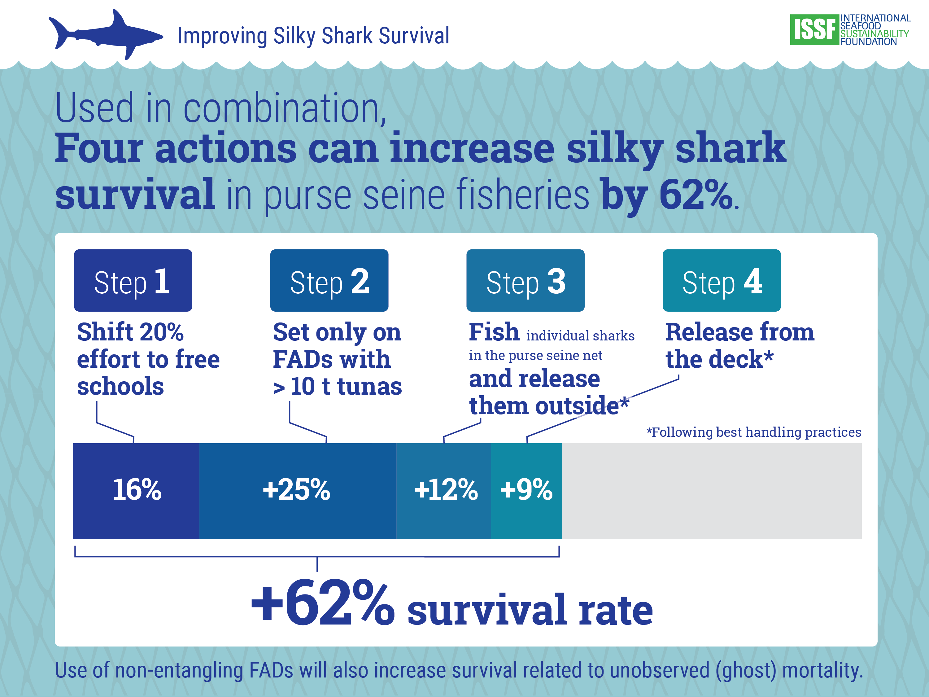 This infographic shows four steps that purse seine fishers can take to decrease the bycatch of silky sharks (Carcharhinus falciformis) and improve their survival rate.
