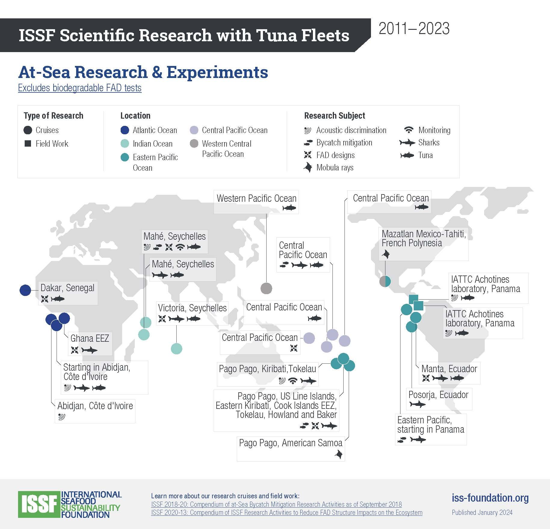 This map infographic, revised in January 2024, shows the locations and extent of ISSF’s research with tuna fleets, including at-sea research cruises and biodegradable FAD projects, since 2011. Some of the research projects also have included government and NGO partners.