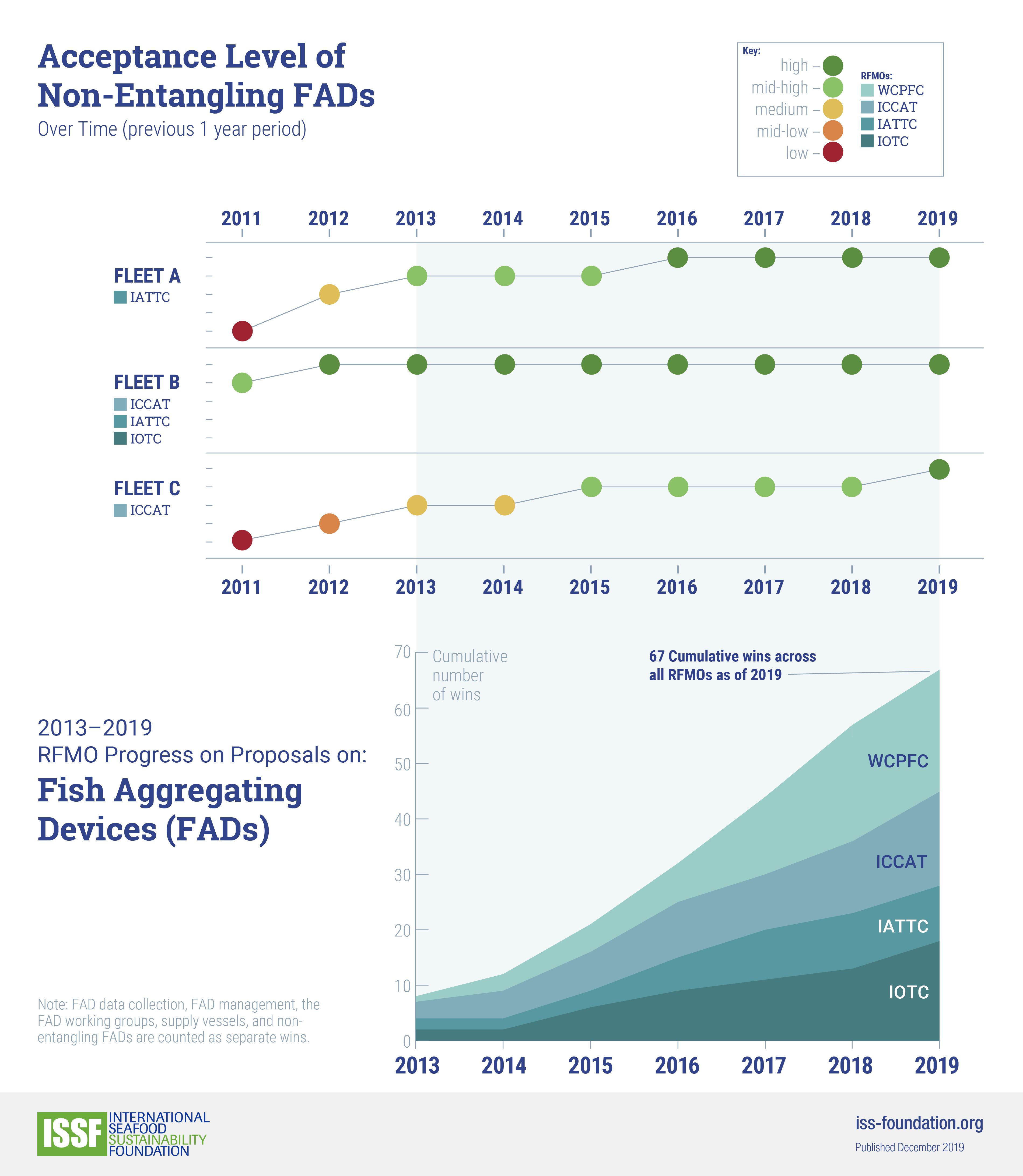 In ISSF Skippers Workshops, skipper participants share feedback on different sustainable fishing approaches. This infographic, updated in December 2019, tracks changes in skippers’ acceptance of switching to non-entangling fish aggregating devices (FADs) from traditional FADs to reduce shark and other bycatch in tuna fisheries. It also shows the number of Regional Fisheries Management Organization (RFMOs) proposals relating to policies on non-entangling FADs in fisheries.