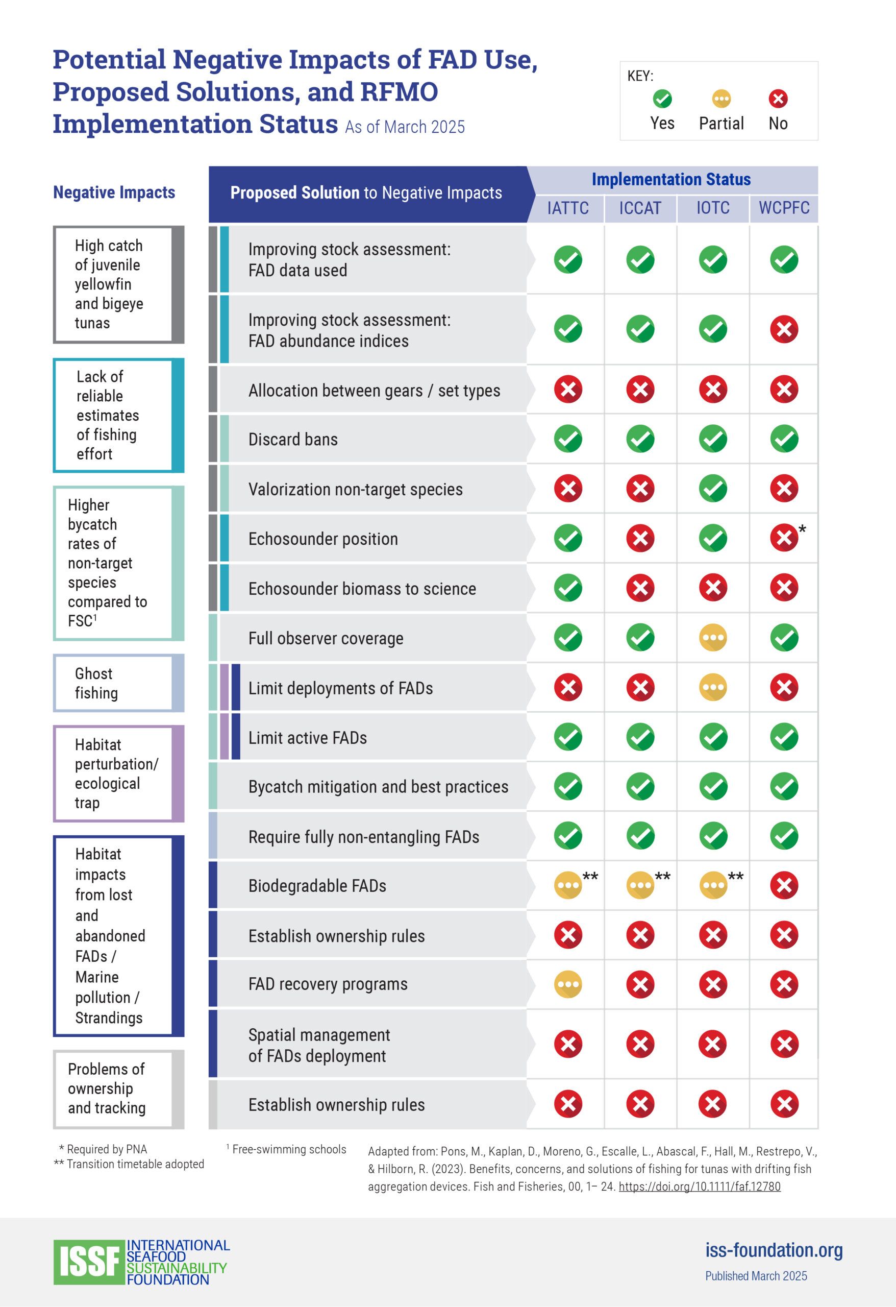 This infographic identifies solutions to several potential negative impacts of Fish Aggregating Devices (FADs), and then tracks four tuna Regional Fisheries Management Organizations’ implementation of the solutions.