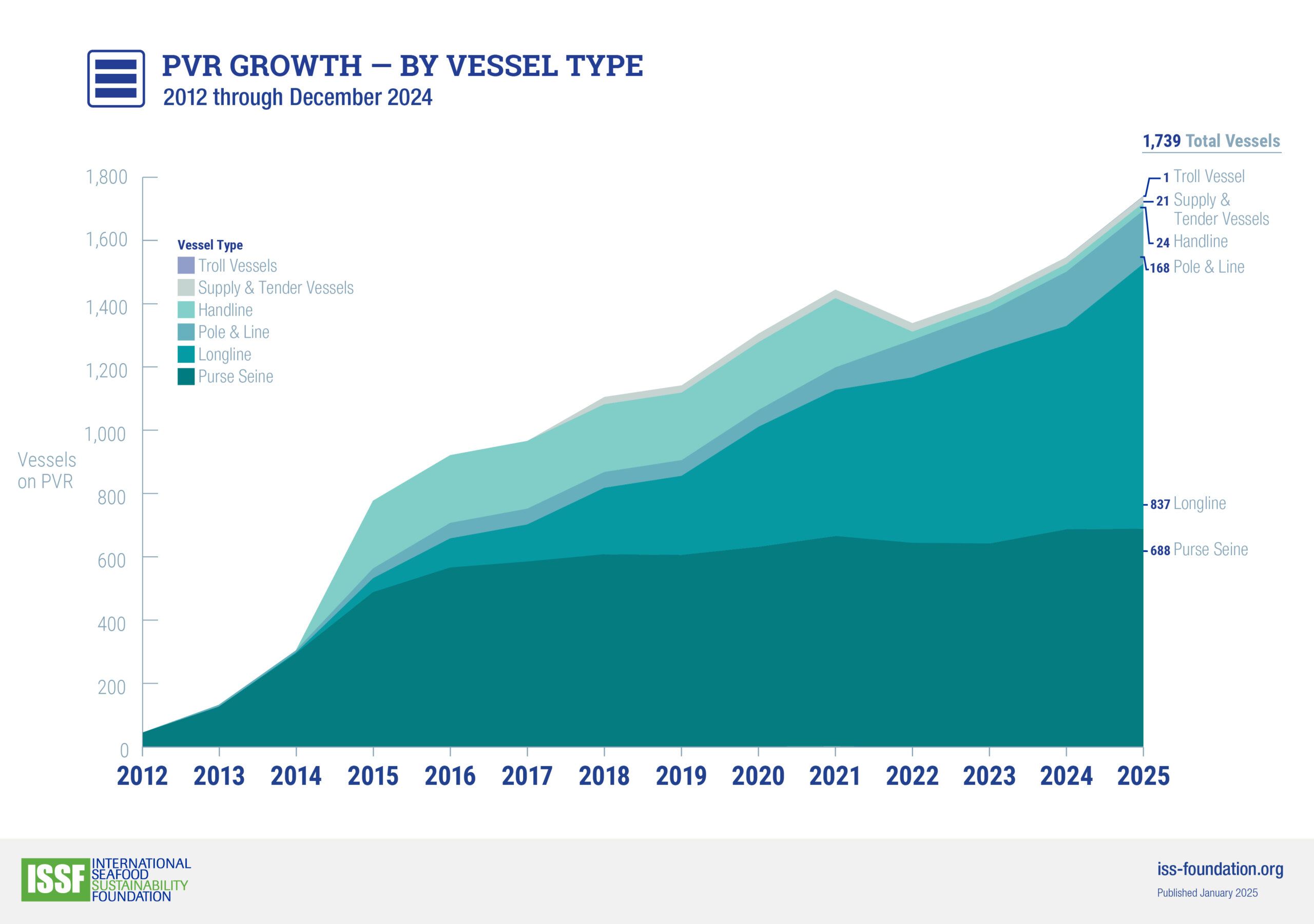 This infographic shows how ISSF’s ProActive Vessel Register has grown from 2012 through 2024, both in number and type of vessel (handline, longline, pole & line, purse seine, supply & tender, and troll).