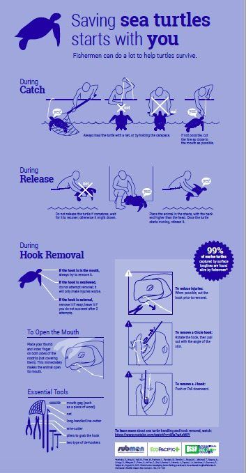 This infographic shows fishermen how to safely handle sea turtles unintentionally caught during tuna fishing to help them survive.