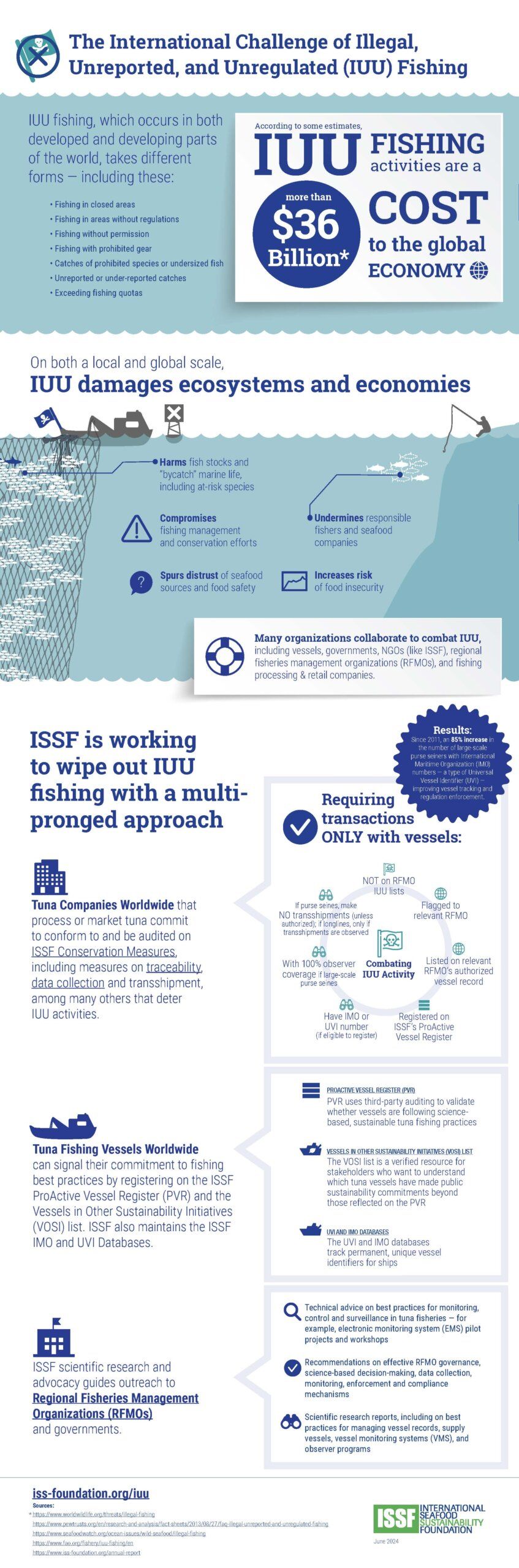 This infographic describes the negative impact of illegal fishing, a problem across the world’s oceans, and explains what ISSF does to help combat it. It was updated in June 2024.