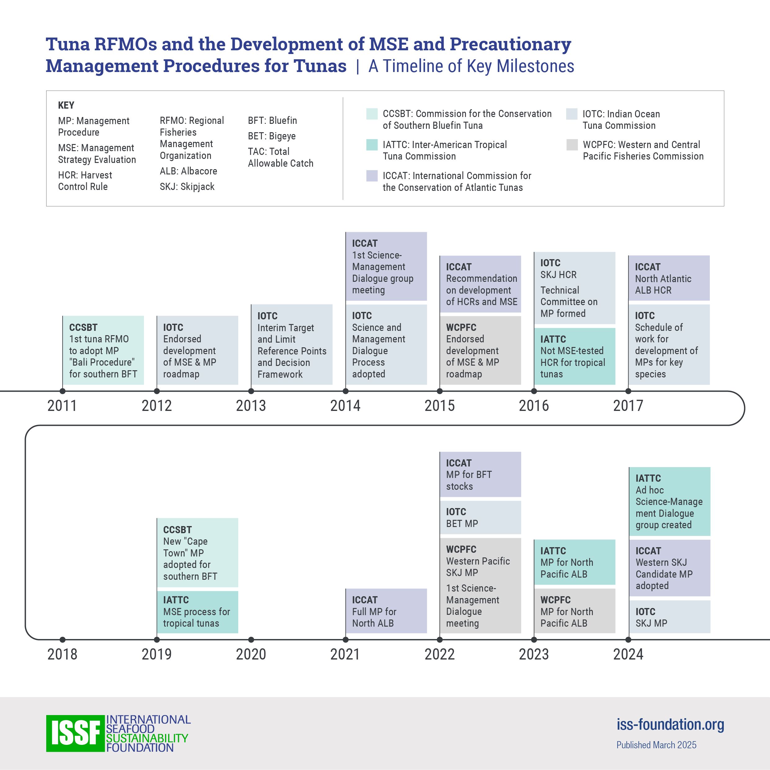 This timeline graphic, developed in March 2025, shows 2011–2024 milestones in efforts by all tuna Regional Fisheries Management Organizations (RFMOs) to develop management strategy evaluations (MSE) and precautionary management procedures (MP) for albacore, bigeye, bluefin, and skipjack tuna stocks.