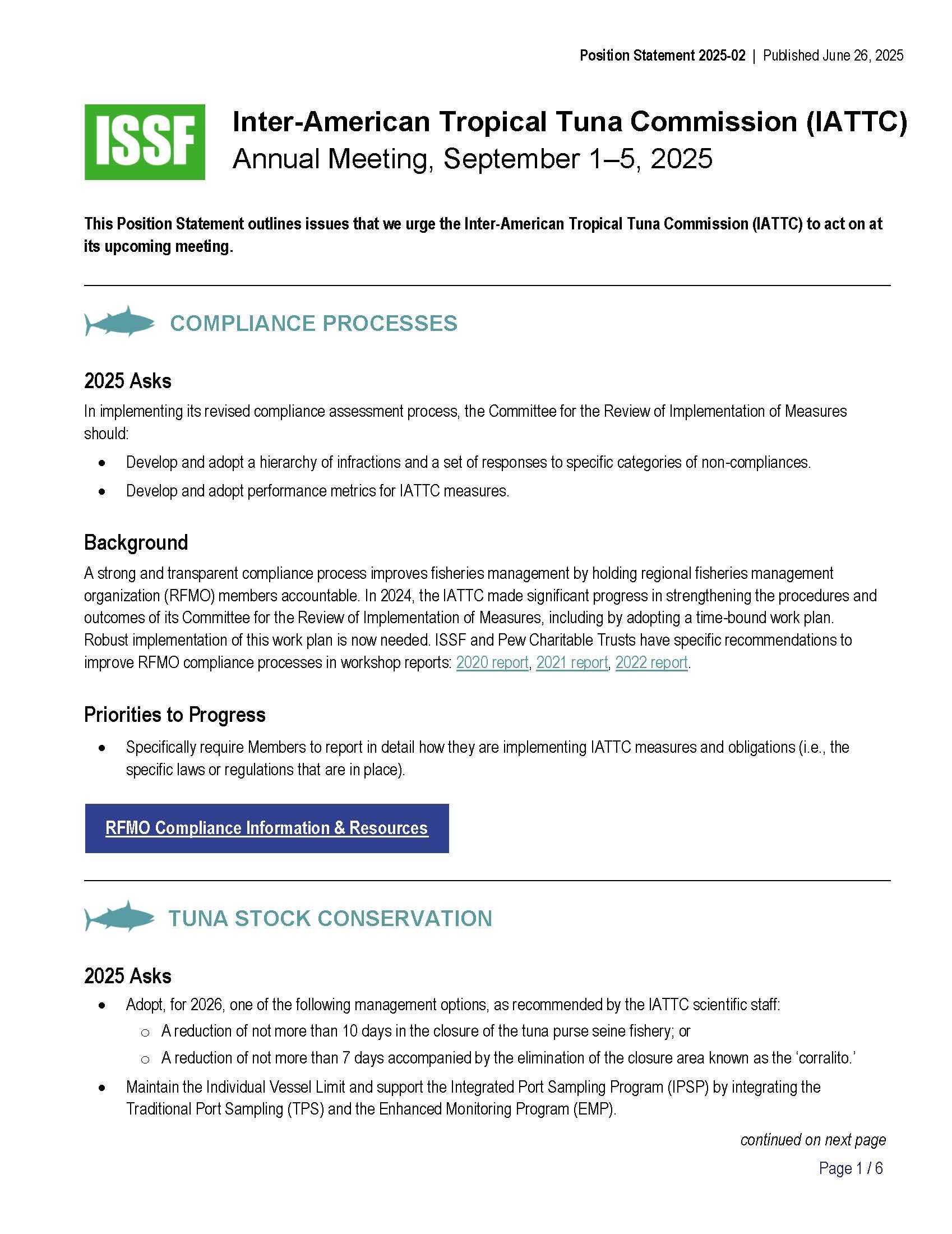 ISSF prepared this position statement in June 2025 for consideration at the 103rd meeting of the Inter-American Tropical Tuna Commission (IATTC), which will take place September 1-5, 2025, in Panama City, Panama. The statement covers topics in these categories: compliance processes, tuna stock conservation, FAD management, electronic monitoring and reporting, observer coverage, harvest strategies, bycatch mitigation and shark protections, transshipment regulation, vessel monitoring systems, port state measures, and capacity.