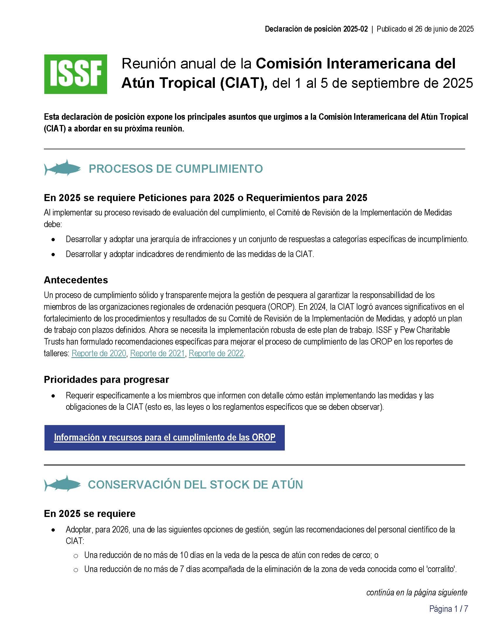 La ISSF preparó esta declaración de posición en junio de 2025 para su consideración en el 103º período de sesiones de la Comisión Interamericana del Atún Tropical (CIAT), que tendrá lugar del 1-5 de septiembre de 2025, en la Ciudad de Panamá, Panamá. La declaración cubre temas en estas categorías: procesos de cumplimiento; conservación del stock de atún; ordenación de los PCP; seguimiento, reportes y cobertura con des observadores electrónicos; estrategias de captura; mitigación de la captura incidental y protección de los tiburones; regulación de transbordo; sistemas de seguimiento de barcos y medidas portuarias estatales; y capacidad.