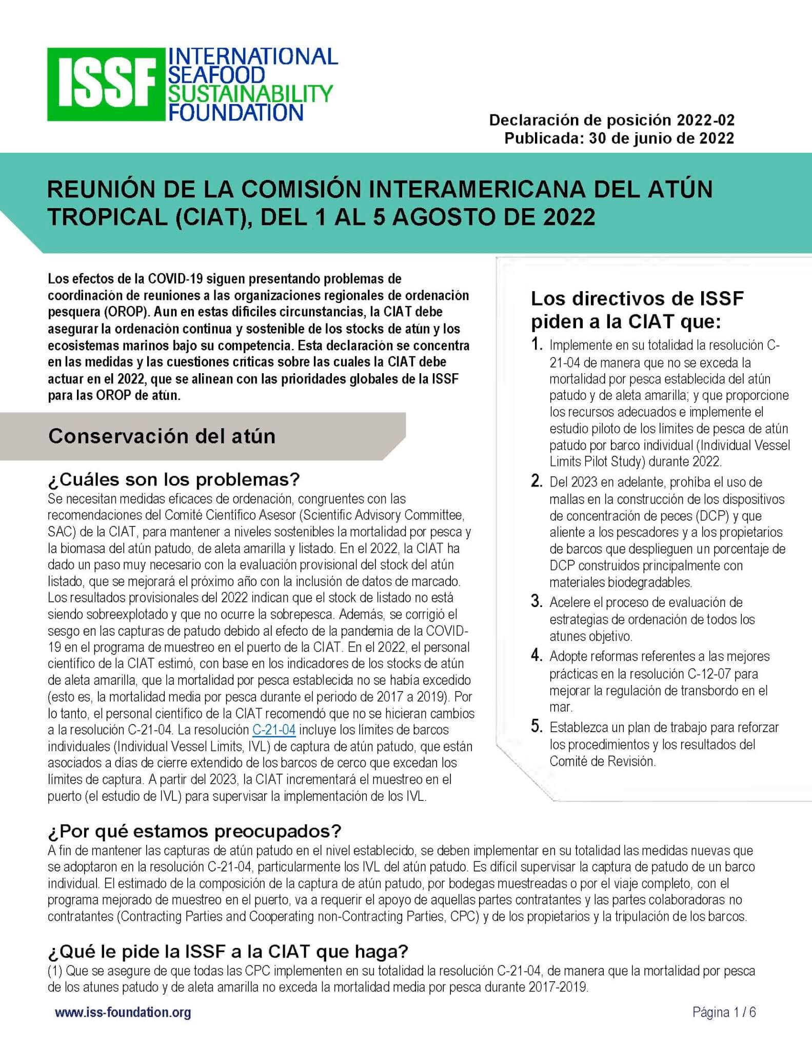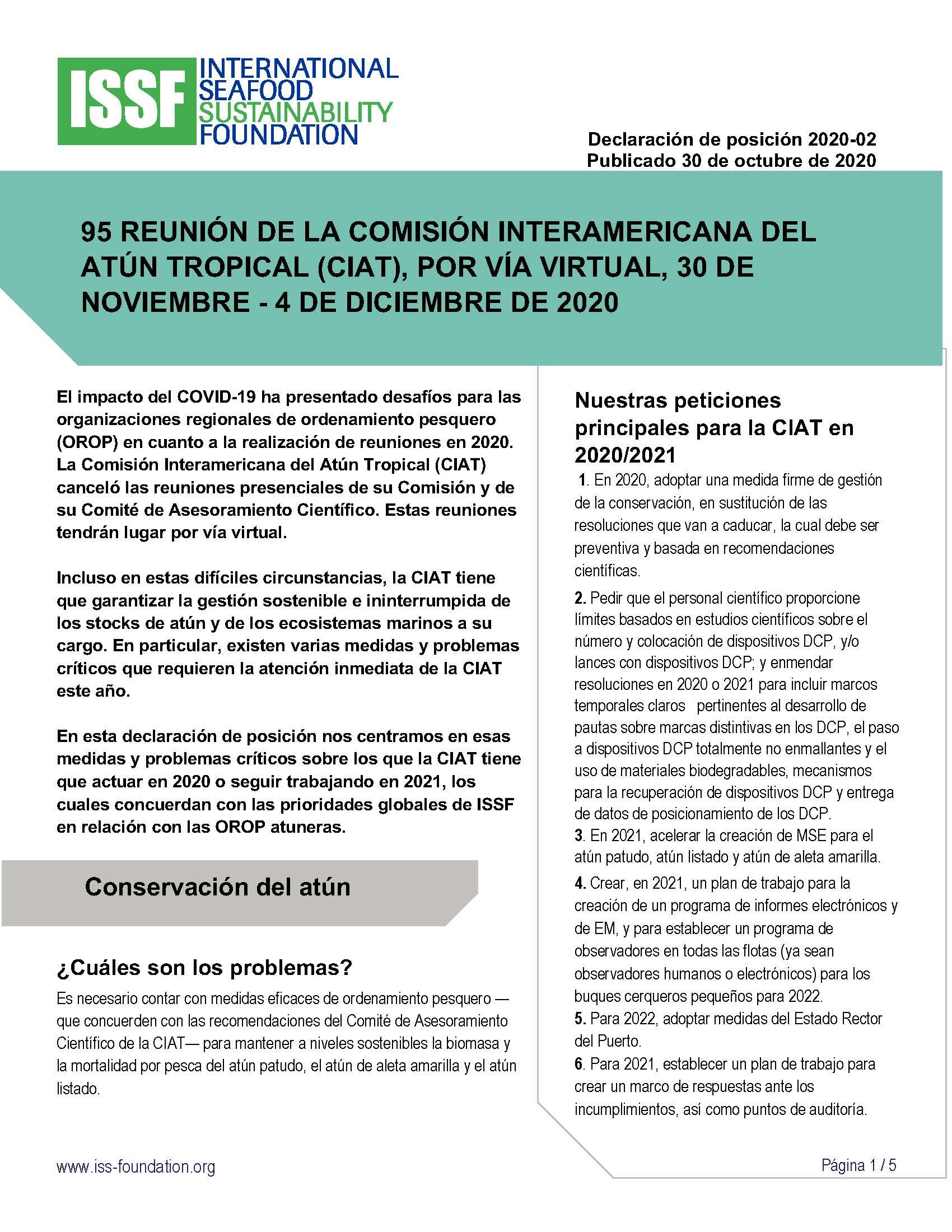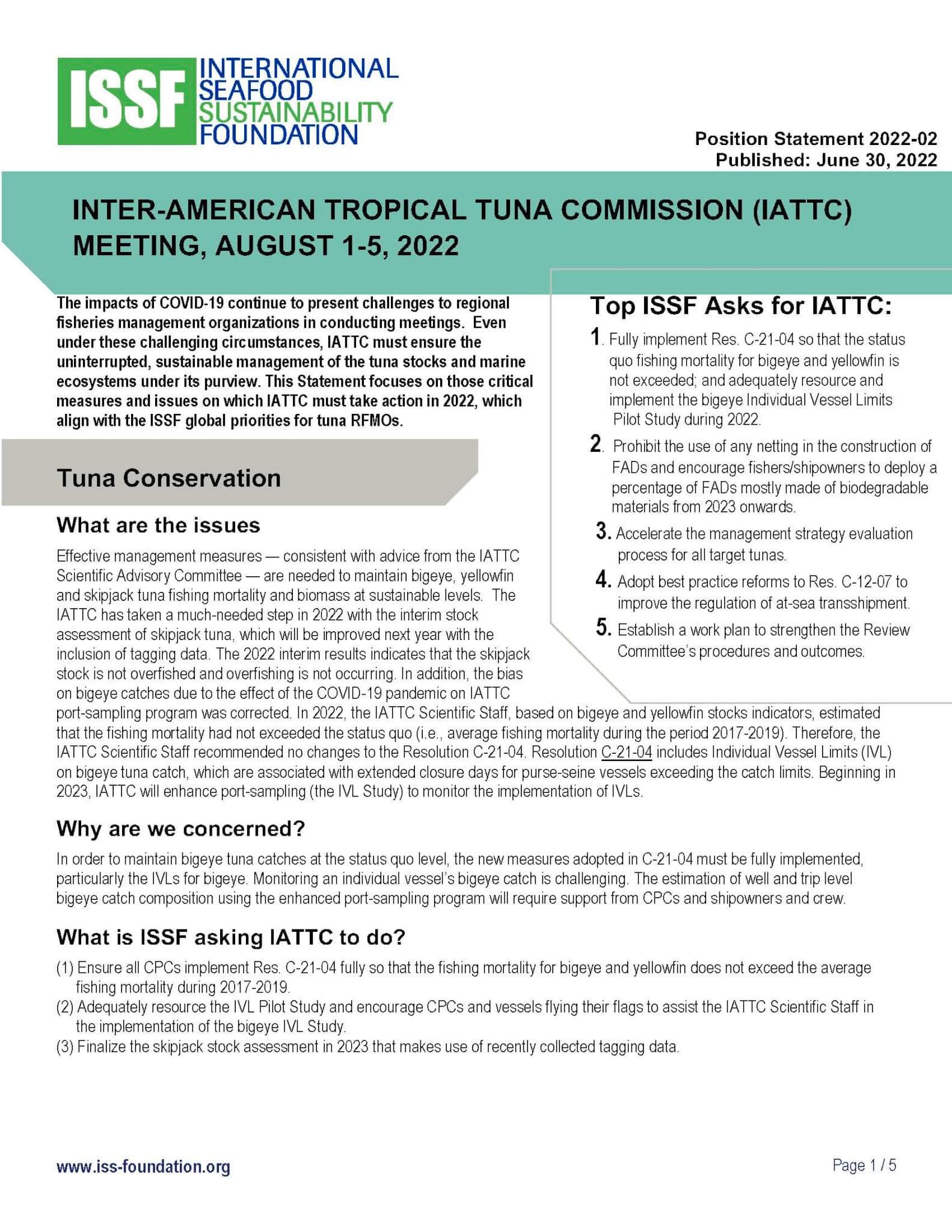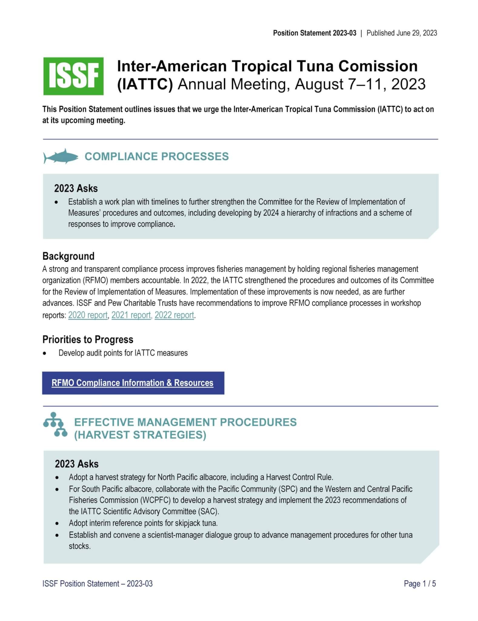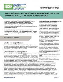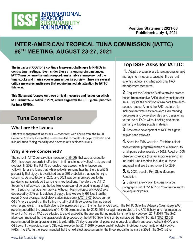 ISSF prepared this position statement in June 2023 for consideration at the 101st session of the Inter-American Tropical Tuna Commission (IATTC), which will take place August 7-11, 2023, in Victoria, British Columbia, Canada. The statement covers topics in these categories: compliance, harvest strategies, FAD management, tuna stock conservation, bycatch mitigation and shark protections, electronic monitoring and reporting, observer coverage, supply and tender vessels, vessel monitoring systems, and capacity management.