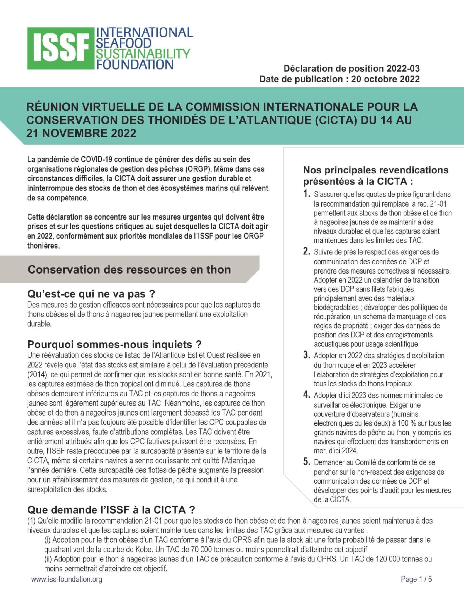 ISSF prepared this position statement for consideration at the International Commission for the Conservation of Atlantic Tunas (ICCAT) 24th regular meeting on November 11-18, 2024. The statement covers topics in these categories: compliance processes; tuna stock conservation; fish aggregating device (FAD) management; electronic monitoring and reporting and observer coverage; transshipment regulation; effective management procedures (harvest strategies); bycatch mitigation and shark protections; and capacity. The statement includes ISSF’s top “asks” or requests of ICCAT.