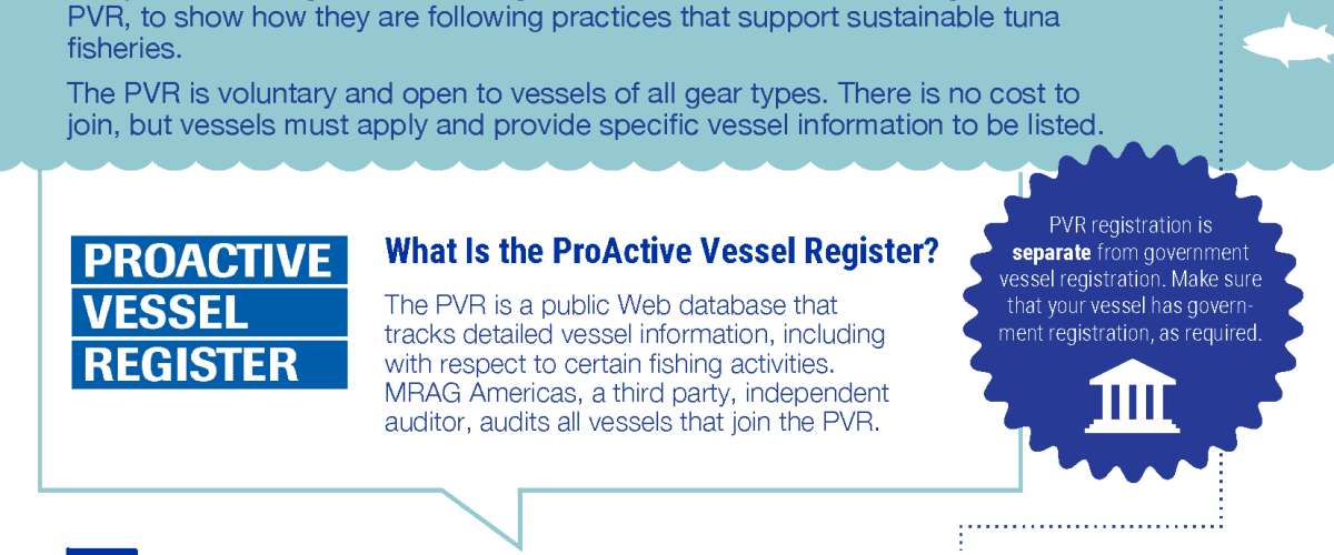 The ProActive Vessel Register (PVR) is one of four public vessel lists that ISSF provides to foster transparency in tuna fishing. Fishing vessels can apply to be registered on the PVR to show how they are following best practices that support sustainable tuna fisheries.